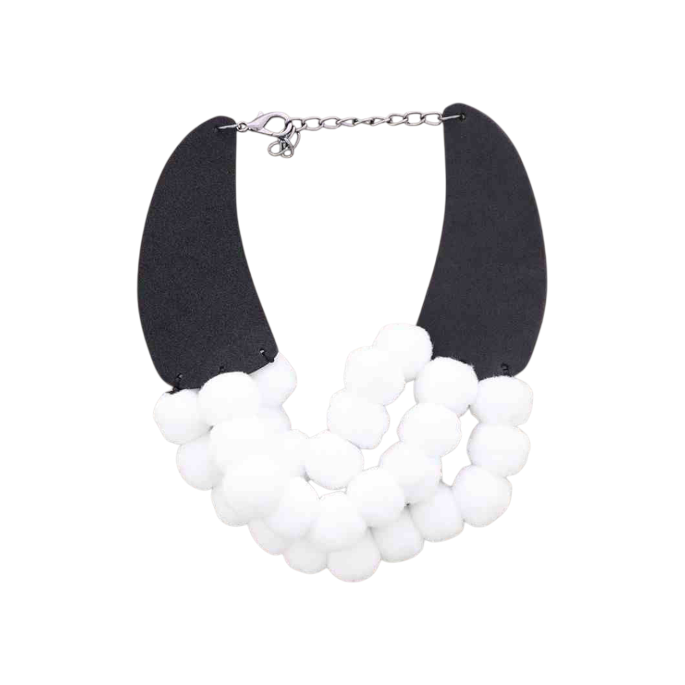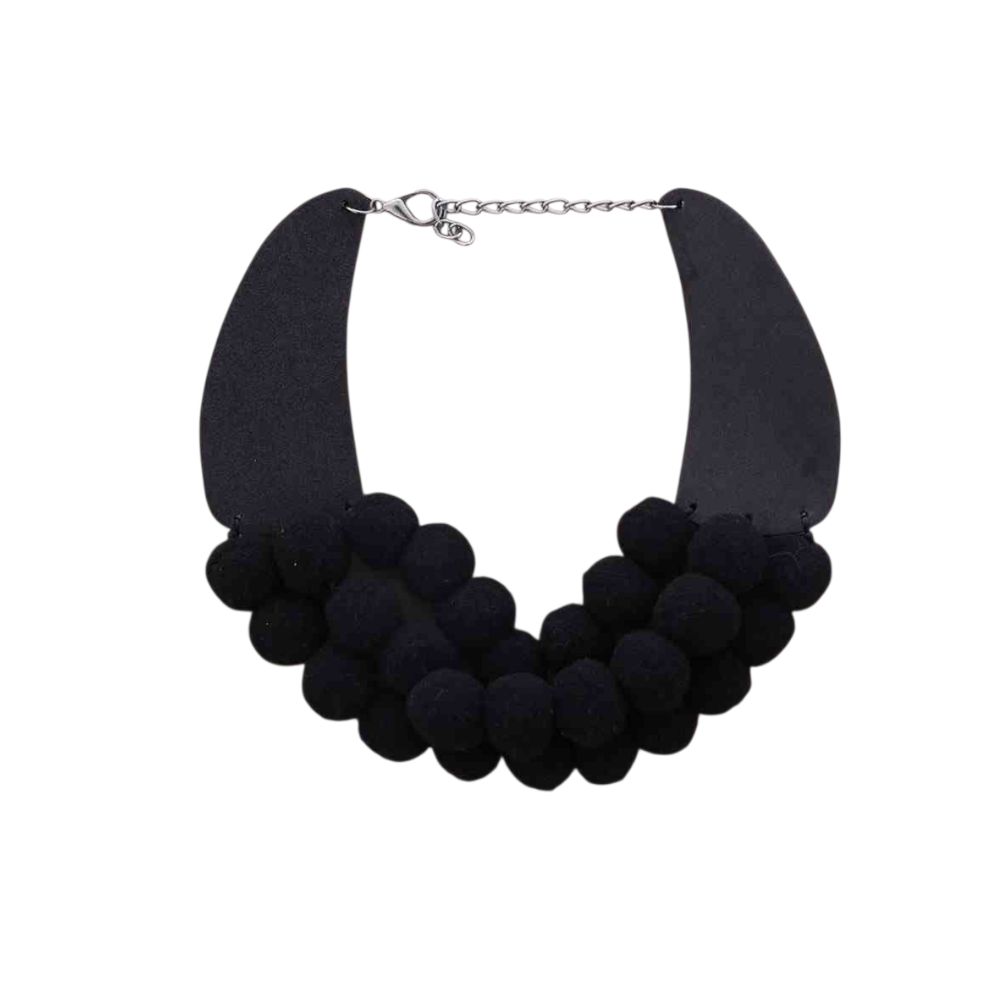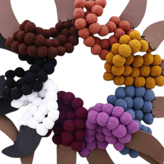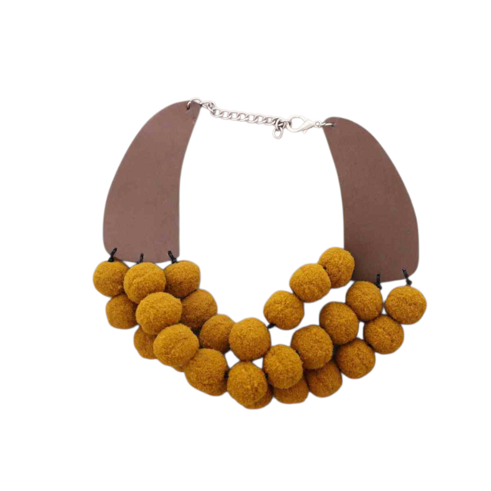 Un accessorio audace e di tendenza. Questa collana girocollo statement presenta una ricca cascata di pompon soffici colorati, fissati a un design rigido in ecopelle color cuoio/marrone chiaro.