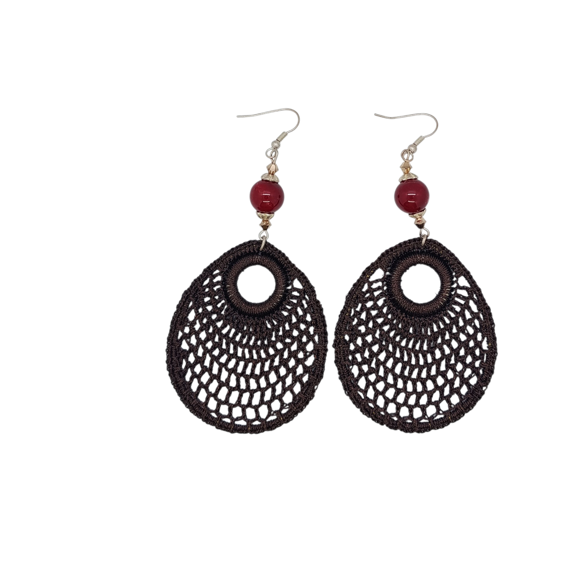 • Design Unico: La base è realizzata con un'accurata lavorazione a uncinetto in cotone color cioccolato fondente (marrone scuro), che crea una delicata trama a rete a forma di goccia allungata.