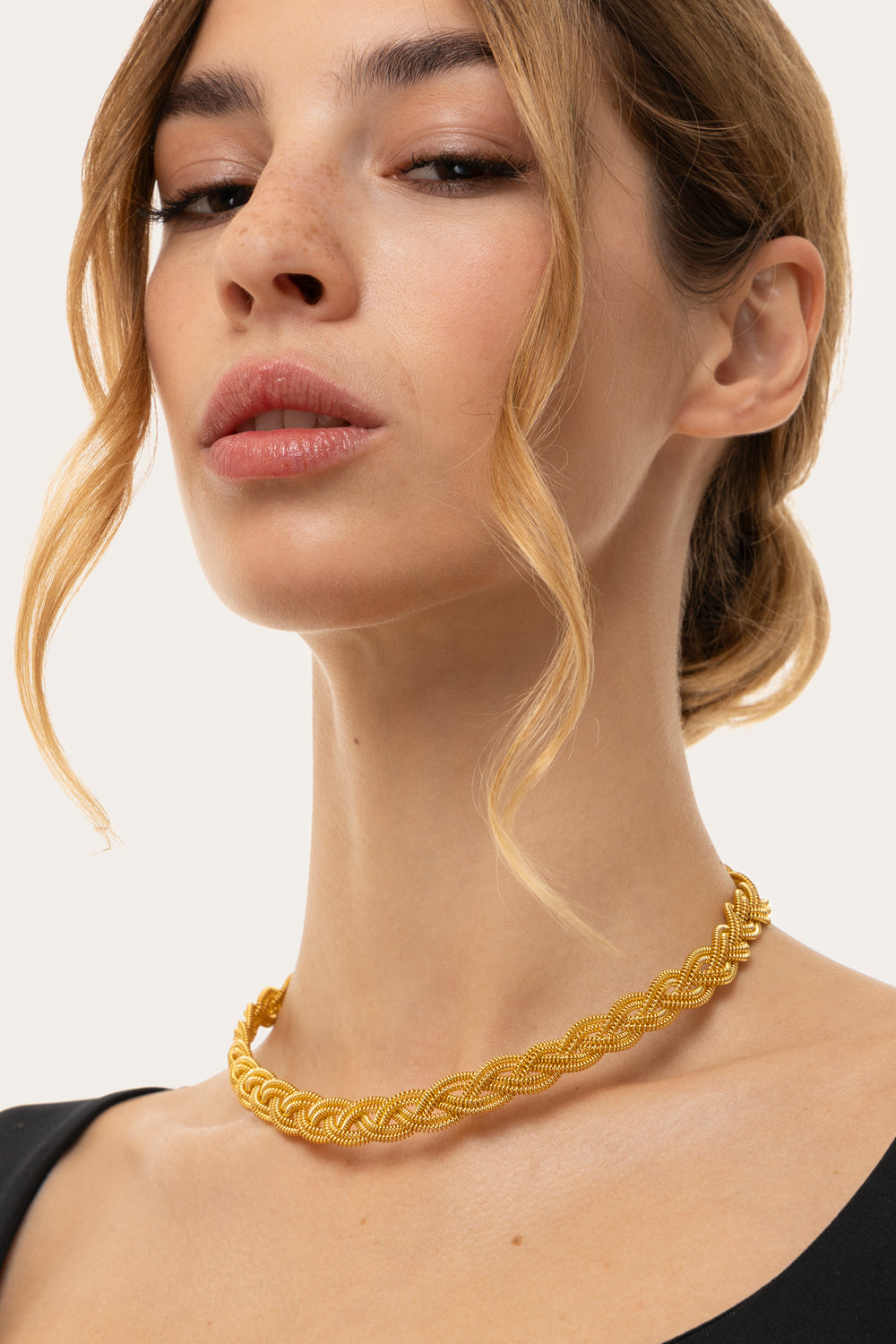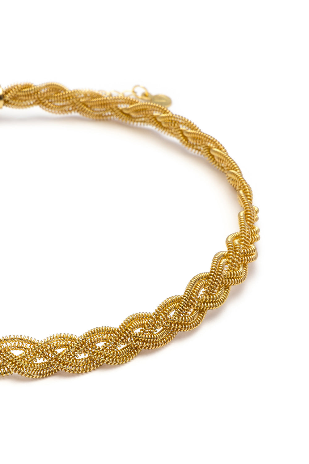 Girocollo in ottone riciclato caratterizzato da un intreccio luminoso ed elegante. Questo gioiello statement evoca eleganza e armonia, rendendolo ideale per look vibranti e femminili. Chiusura regolabile con moschettone. Lunghezza extra chain: 6,5 cm. Nickel tested. Gioielli fatti a mano, unici e artigianali, perfetti per tutti i tuoi look o come idea regalo.