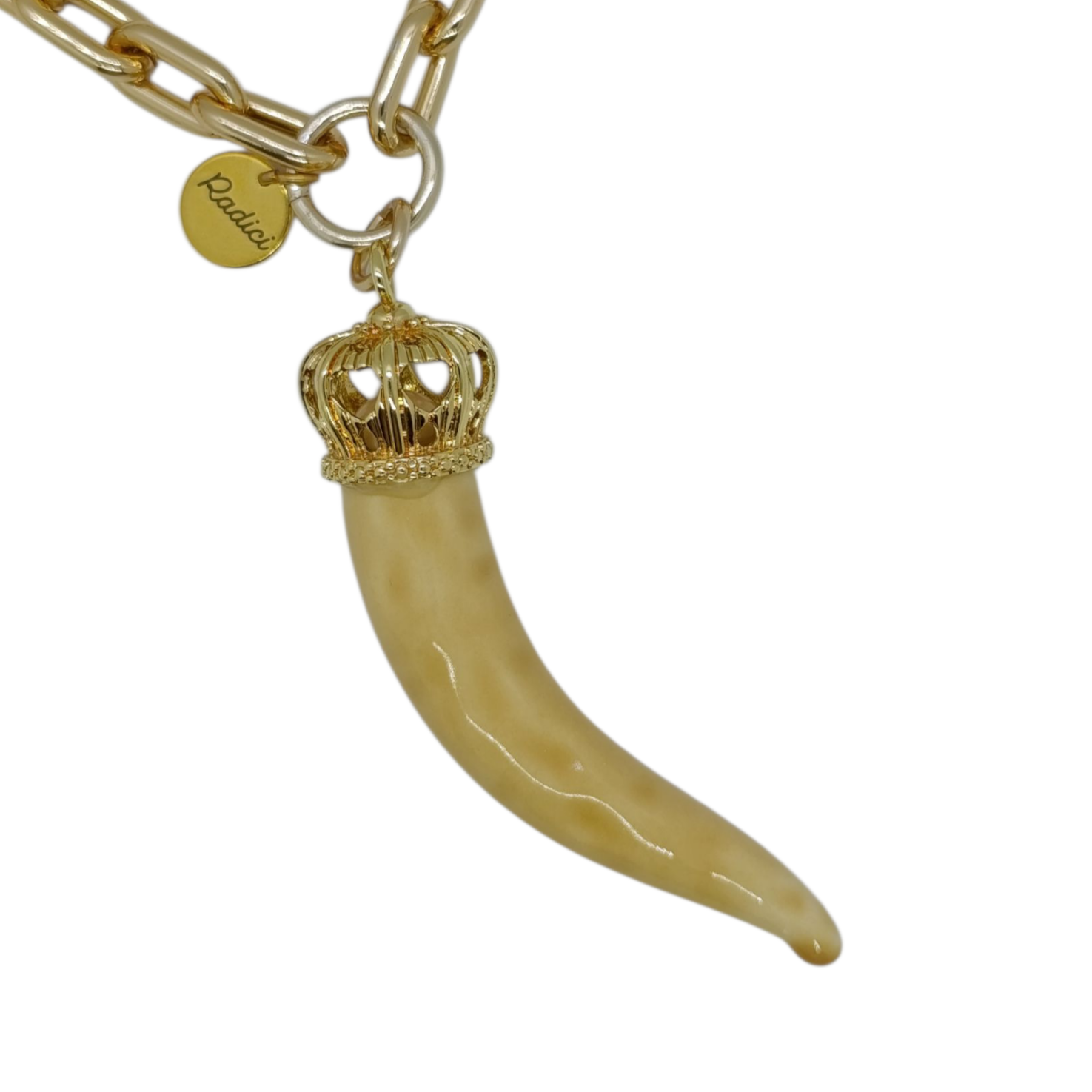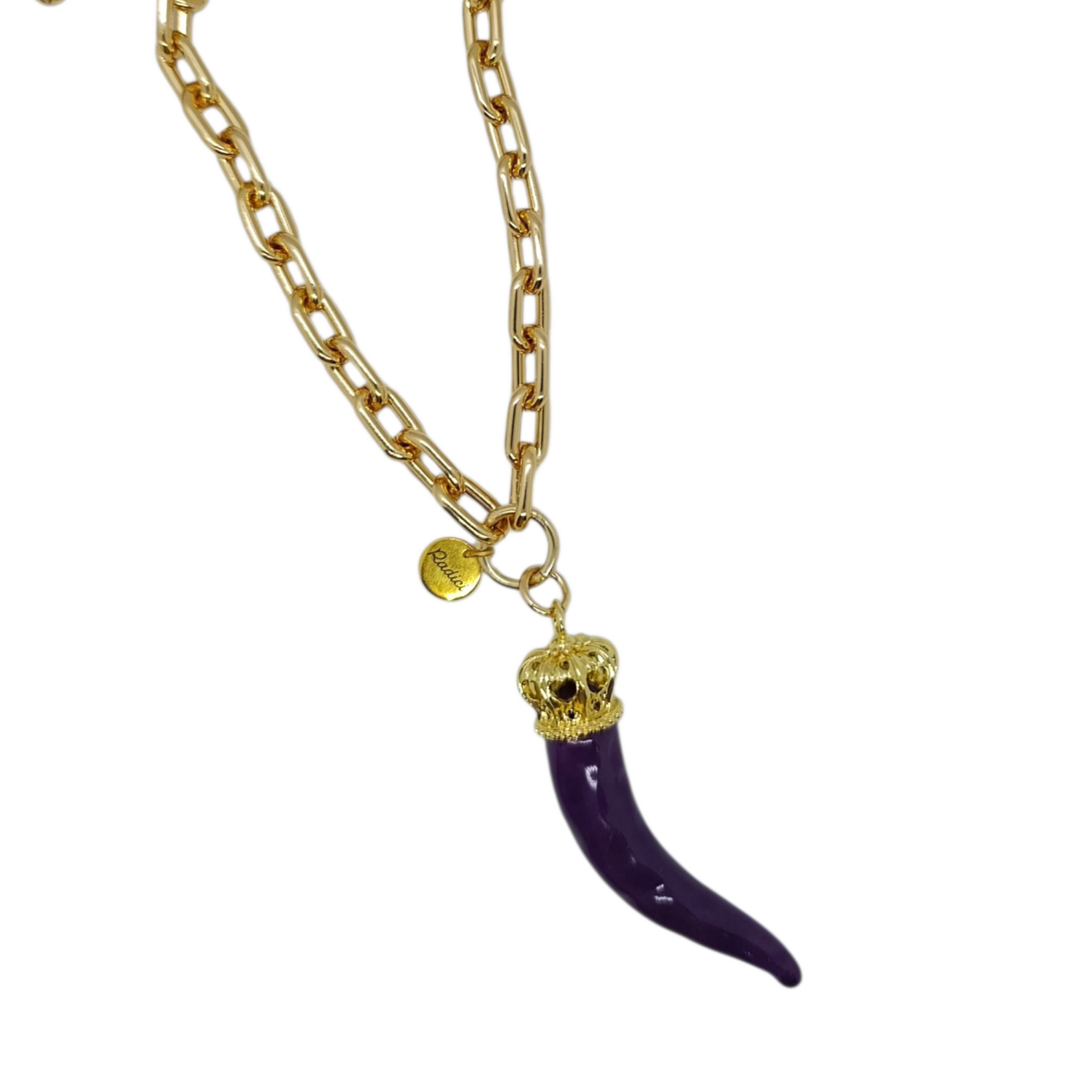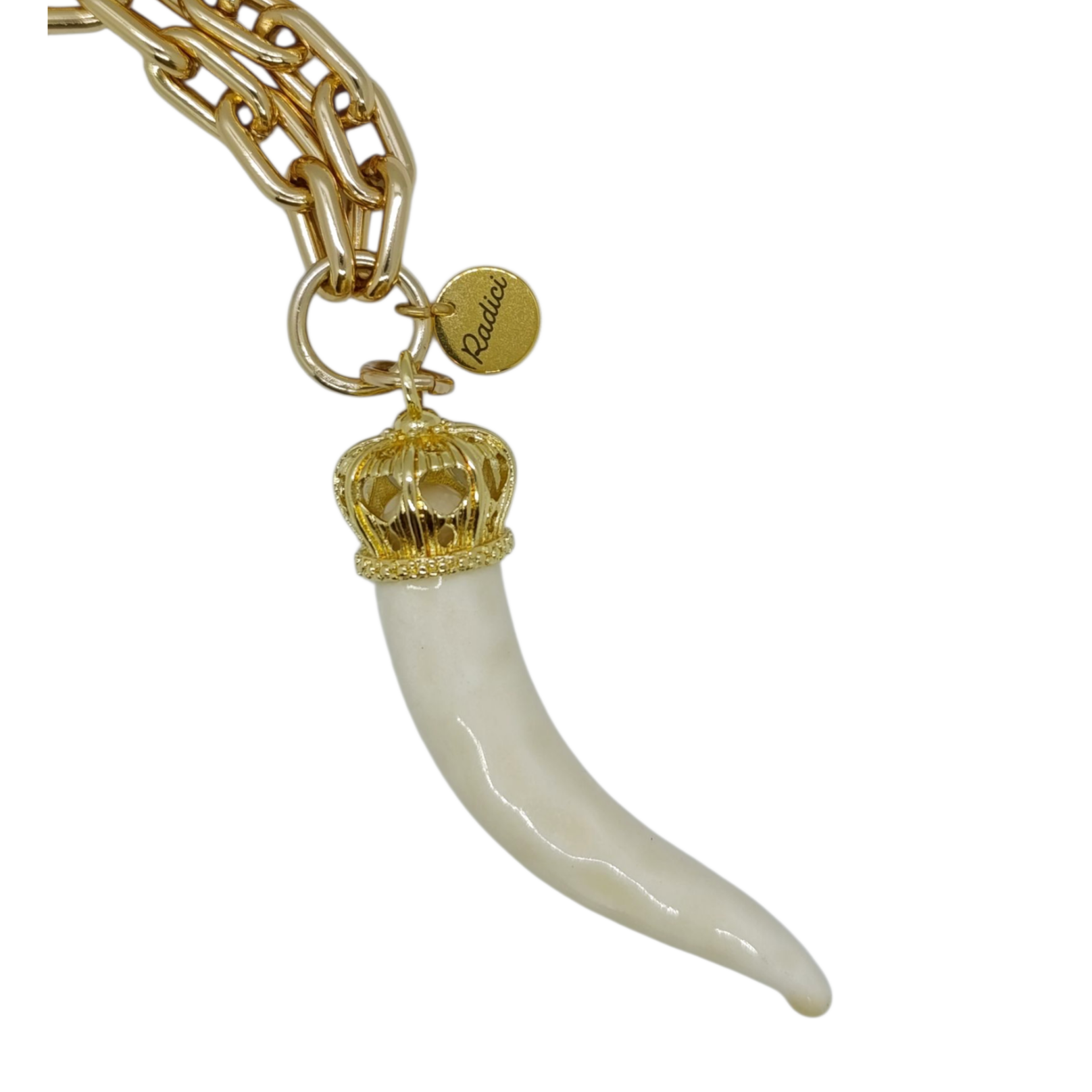 Il corno, simbolo iconico di buona fortuna e protezione, rende questa collana non solo un gioiello di tendenza, ma anche un portafortuna sofisticato.