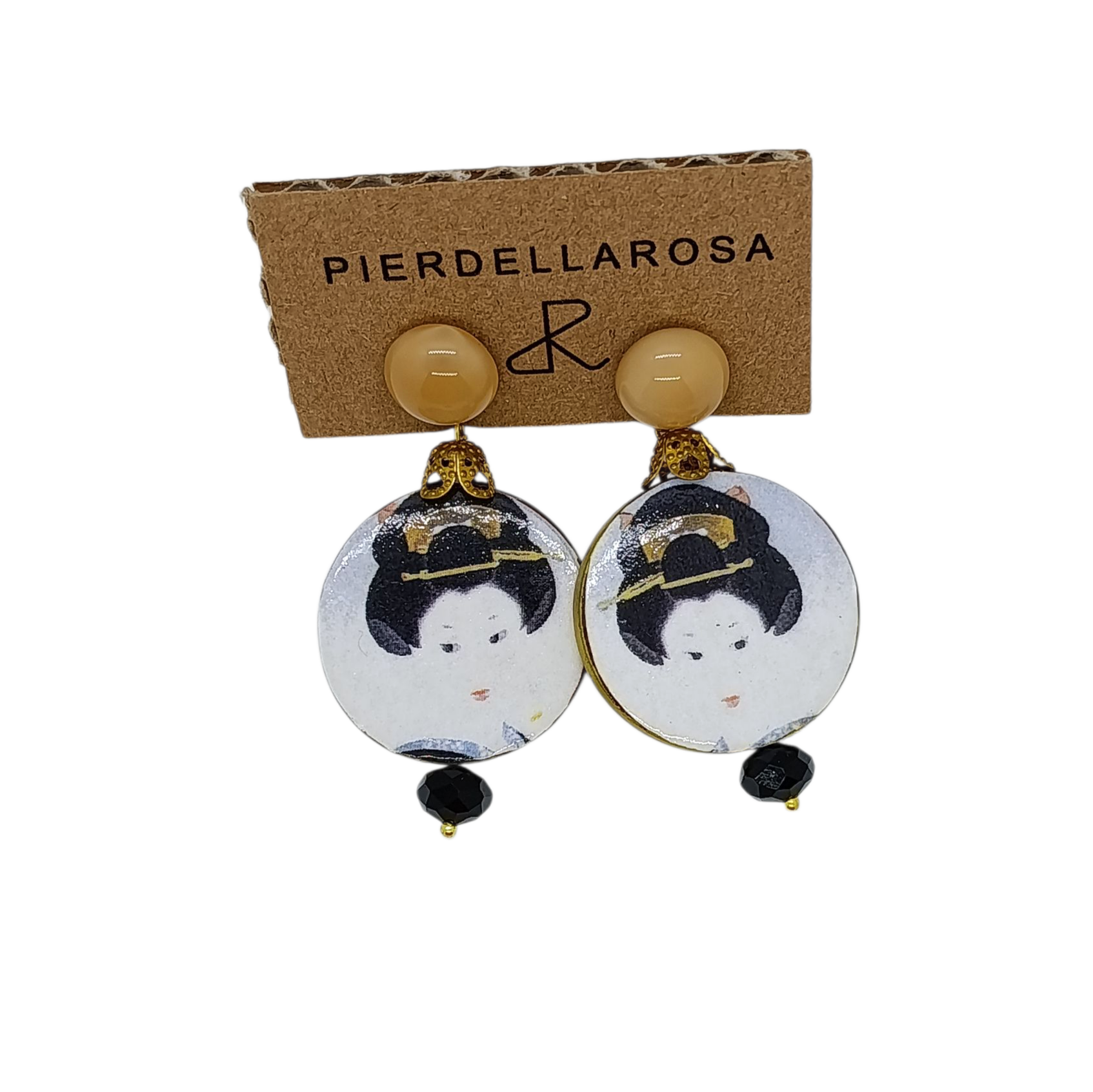 - Orecchini pendenti con medaglioni raffiguranti dama giapponese. Design vintage con sfera color miele e cristallo nero.
