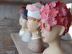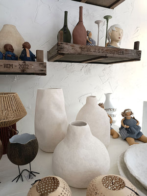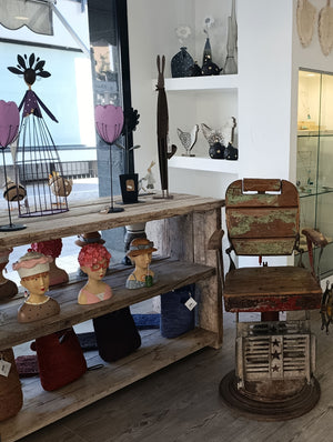 Creazione unica dell'artista greca Xenia. Realizzata a mano con corpo in legno e "abito" in tessuti riciclati inamidati per un effetto vento scultoreo.