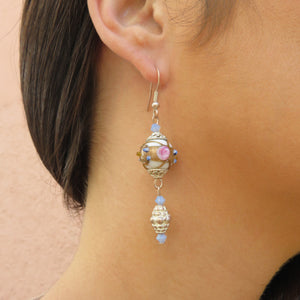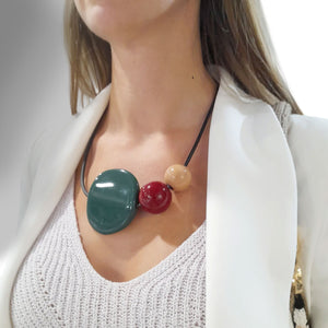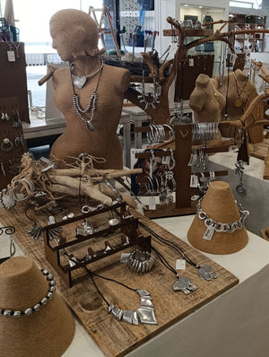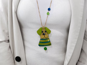 Allegri monili artigianali su base ottone, dipinti a mano con vivaci disegni di case, gatti, pesci ed altri animali.
